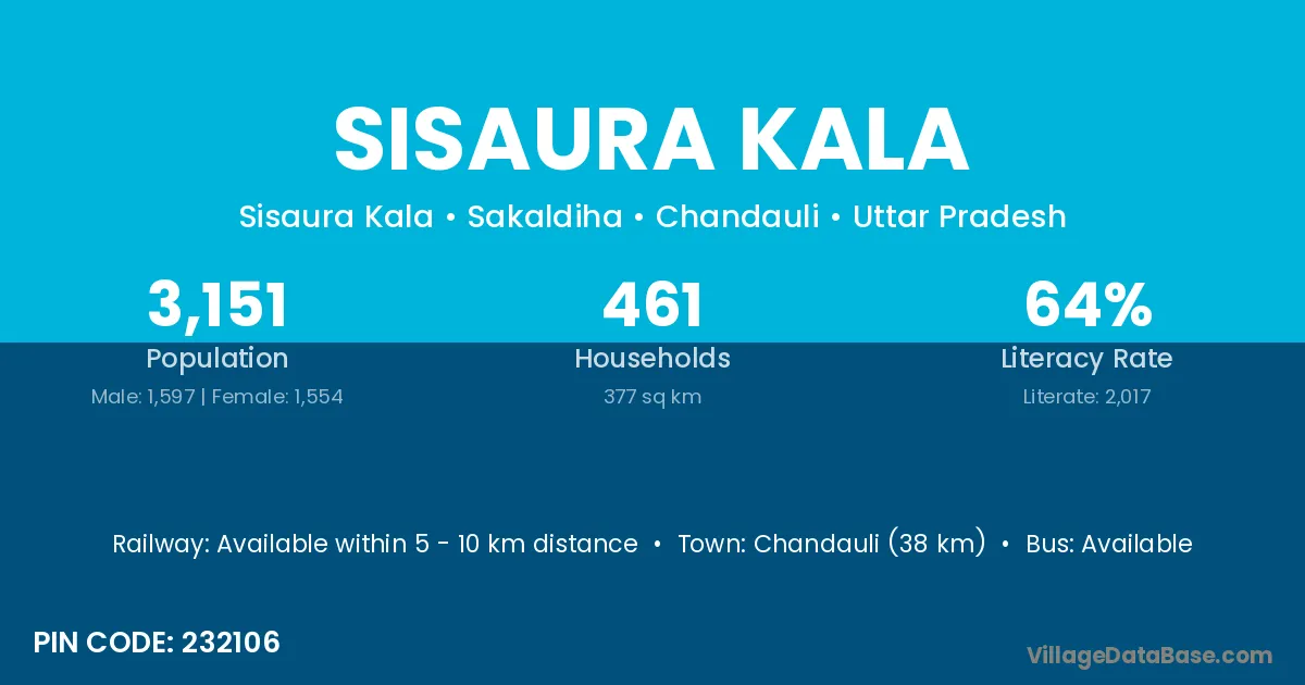 Chandauli (38 km) is the nearest town to Sisaura Kala village for major economic activities and is located approximately 38 km away.