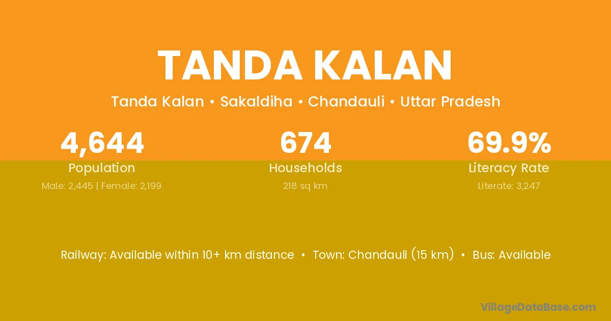 Chandauli (15 km) is the nearest town to Tanda Kalan village for major economic activities and is located approximately 15 km away.