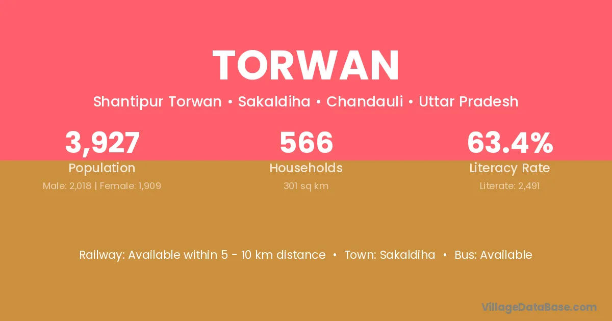 Torwan village has a total population of 3,927 people, of which 2,018 are males and 1,909 are females.