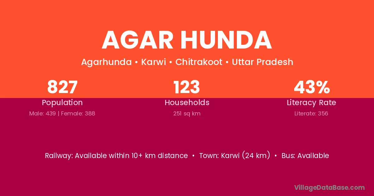 Karwi (24 km) is the nearest town to Agar Hunda village for major economic activities and is located approximately 24 km away.