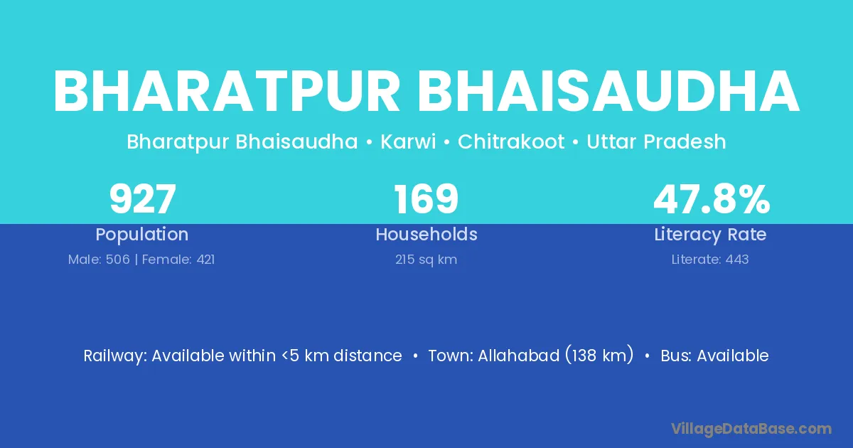 Allahabad (138 km) is the nearest town to Bharatpur Bhaisaudha village for major economic activities and is located approximately 138 km away.