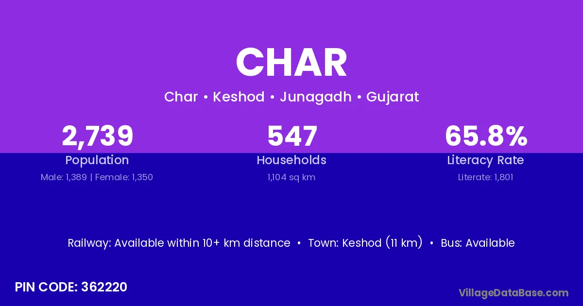The literacy rate of Char village is 62.26%. Male literacy stands at 72.06% and female literacy at 51.74%.