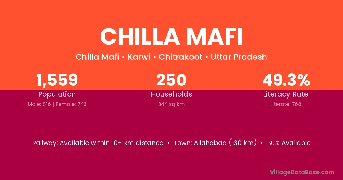 Allahabad (130 km) is the nearest town to Chilla Mafi village for major economic activities and is located approximately 130 km away.