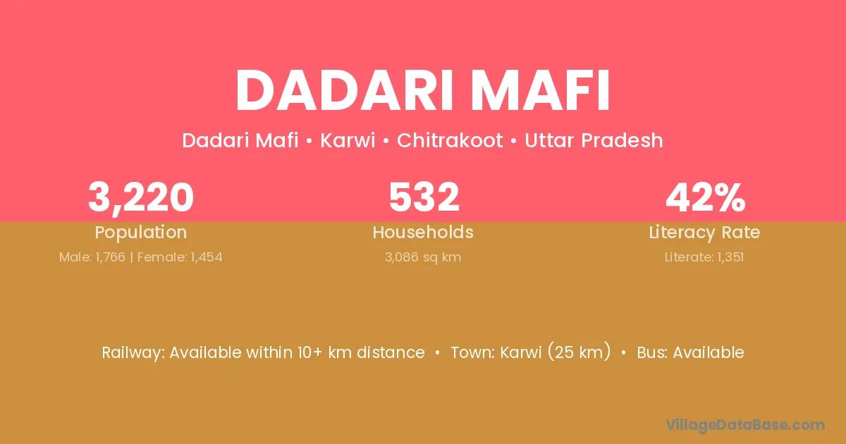 Karwi (25 km) is the nearest town to Dadari Mafi village for major economic activities and is located approximately 25 km away.