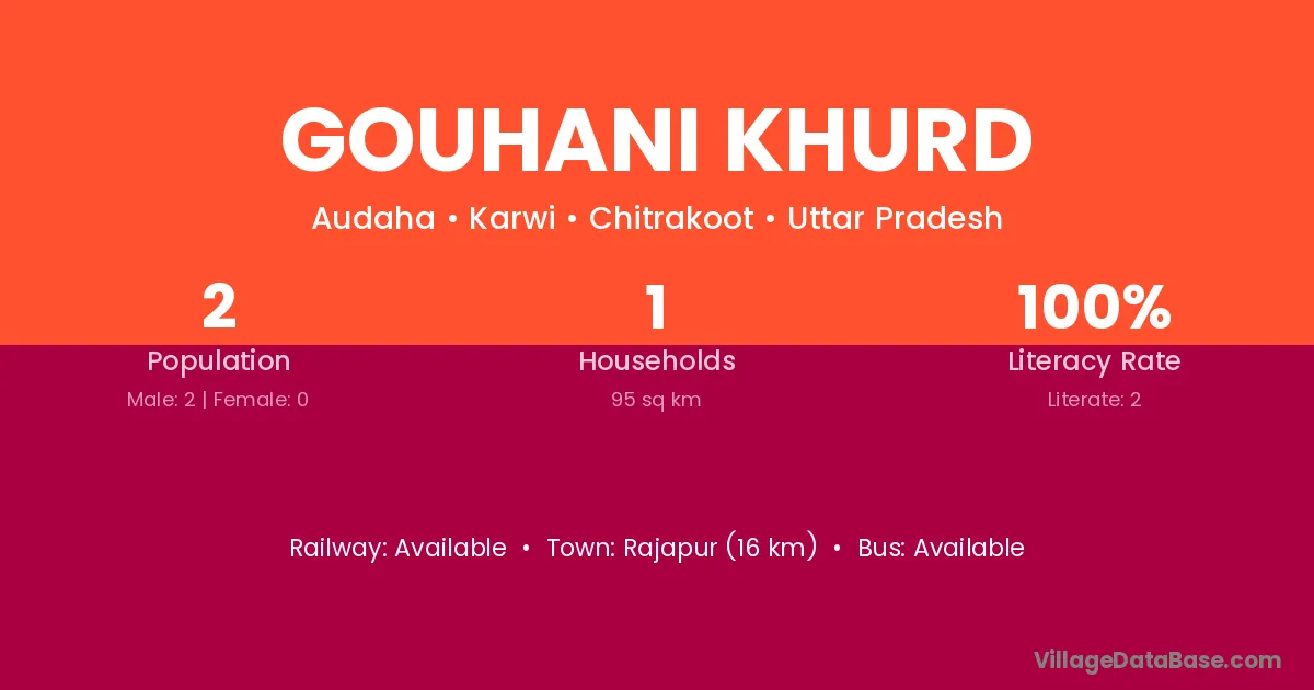 Gouhani Khurd village has a total population of 2 people, of which 2 are males and 0 are females.