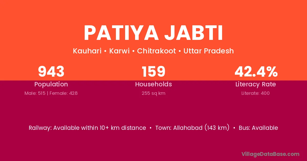 Allahabad (143 km) is the nearest town to Patiya Jabti village for major economic activities and is located approximately 143 km away.