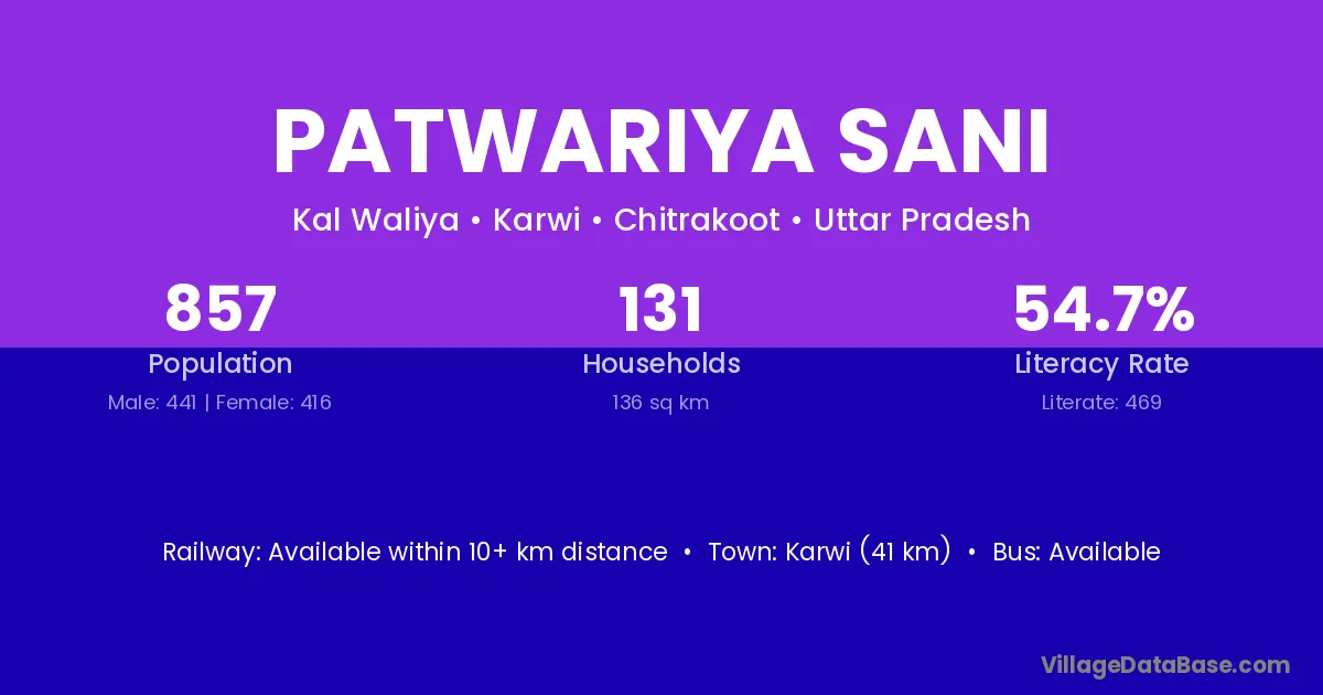 Karwi (41 km) is the nearest town to Patwariya Sani village for major economic activities and is located approximately 41 km away.
