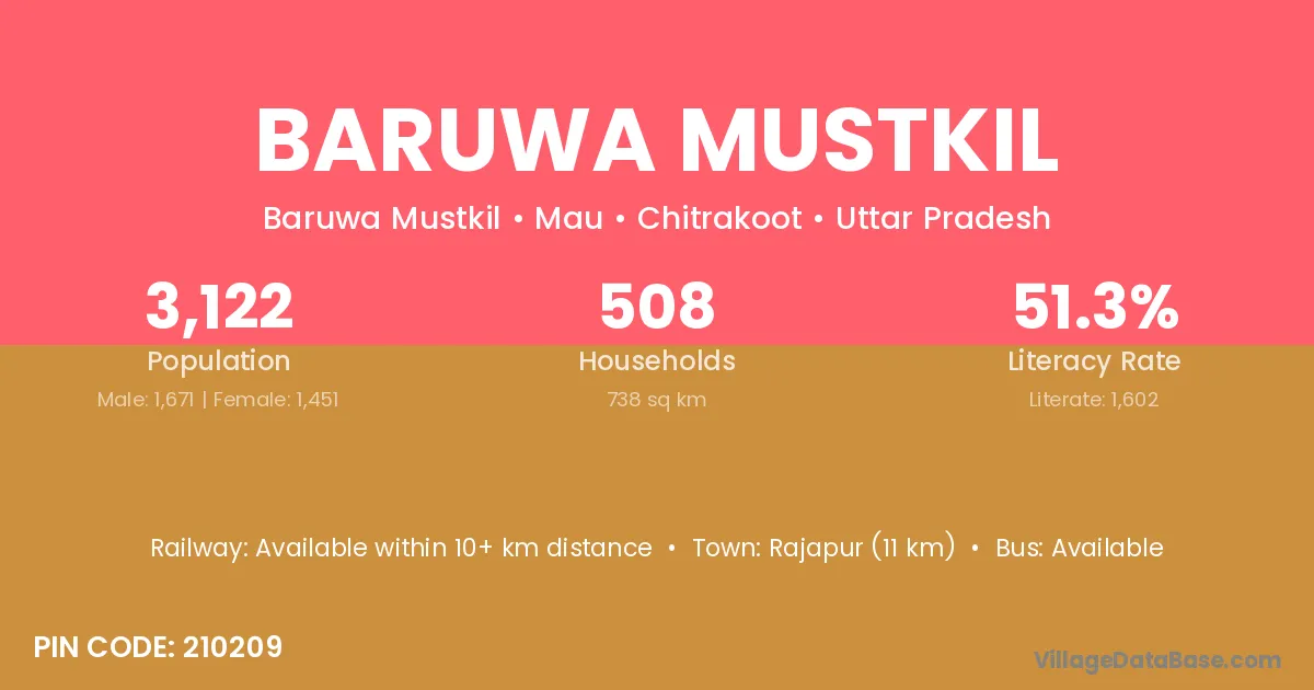 Baruwa Mustkil village has a total population of 3,122 people, of which 1,671 are males and 1,451 are females.