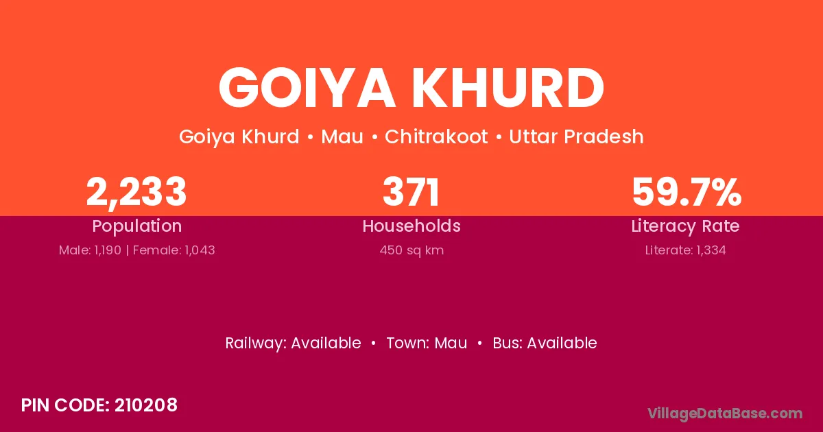 Goiya Khurd village has a total population of 2,233 people, of which 1,190 are males and 1,043 are females.
