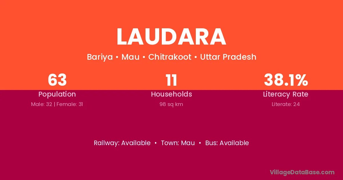 Laudara village has a total population of 63 people, of which 32 are males and 31 are females.