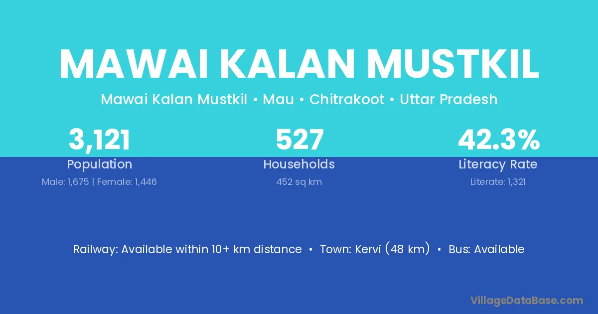 Mawai Kalan Mustkil village has a total population of 3,121 people, of which 1,675 are males and 1,446 are females.