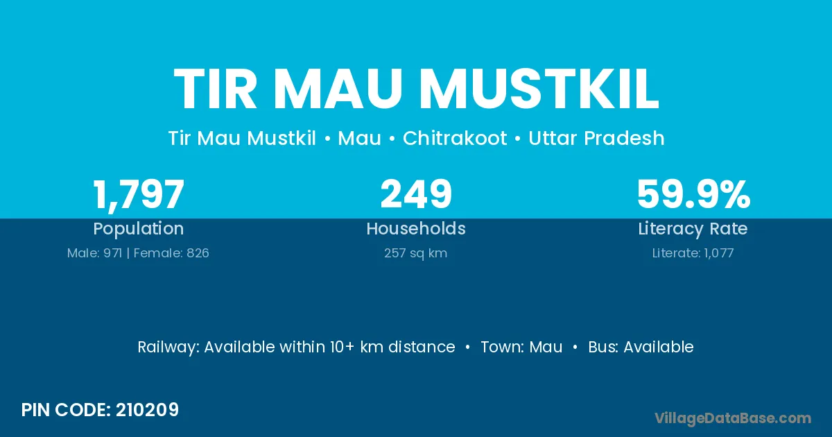 Tir Mau Mustkil village has a total population of 1,797 people, of which 971 are males and 826 are females.