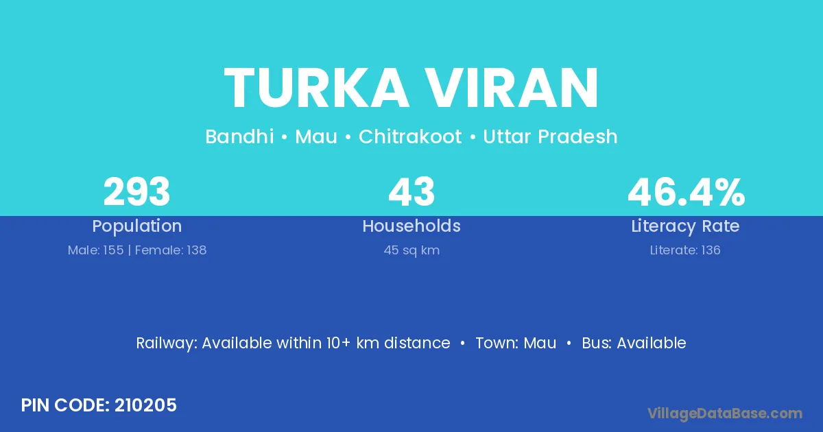 Turka Viran village has a total population of 293 people, of which 155 are males and 138 are females.
