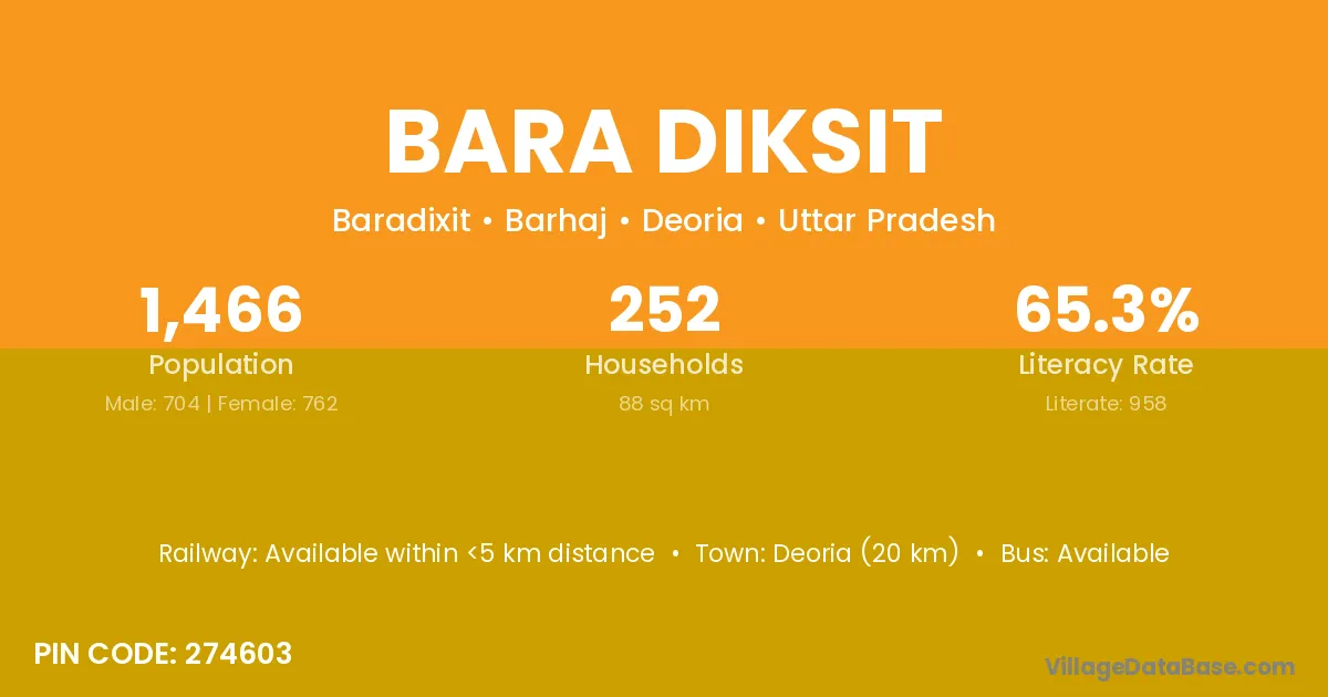 Deoria (20 km) is the nearest town to Bara Diksit village for major economic activities and is located approximately 20 km away.