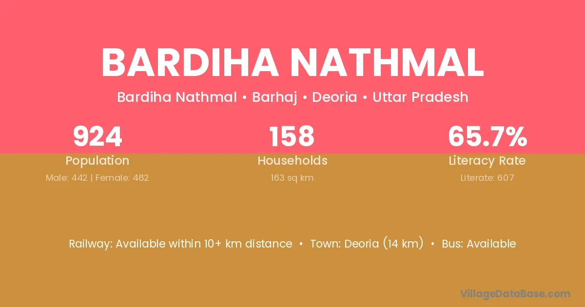 Deoria (14 km) is the nearest town to Bardiha Nathmal village for major economic activities and is located approximately 14 km away.