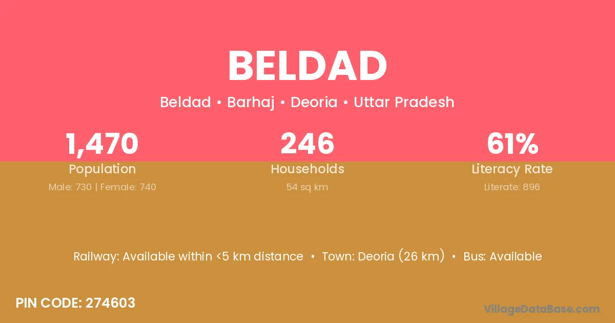 Deoria (26 km) is the nearest town to Beldad village for major economic activities and is located approximately 26 km away.