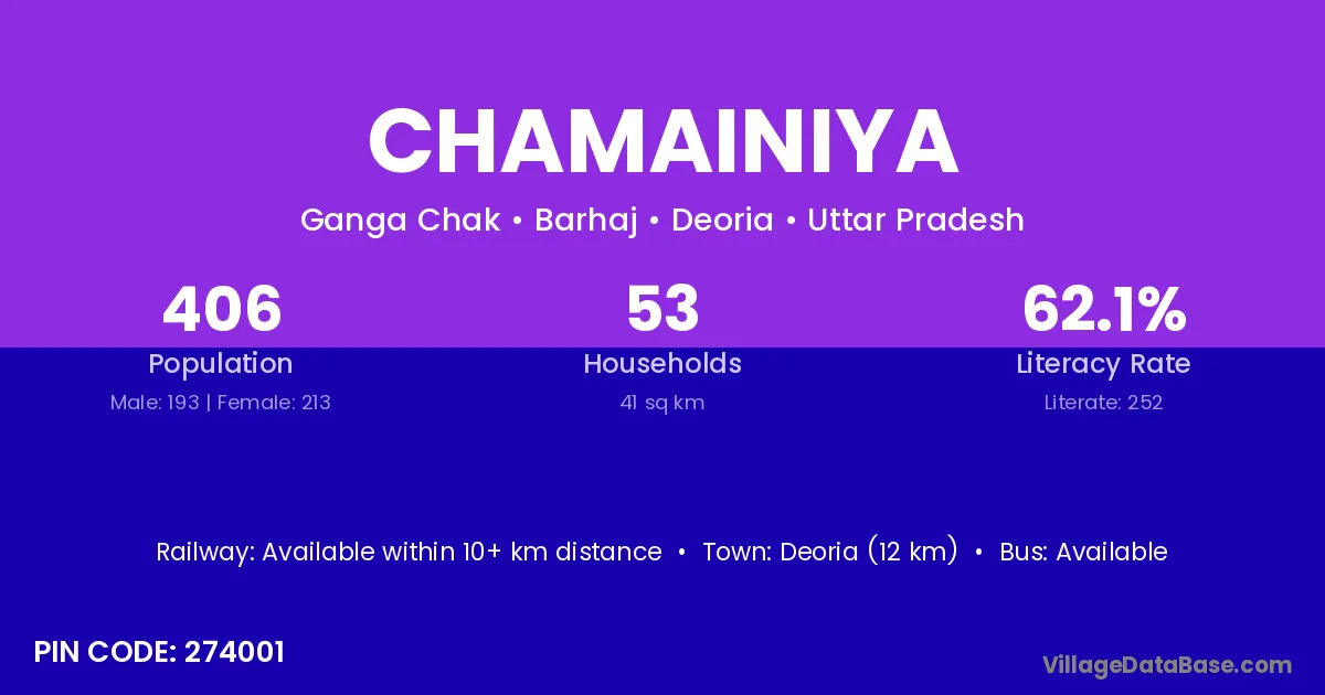 Deoria (12 km) is the nearest town to Chamainiya village for major economic activities and is located approximately 12 km away.