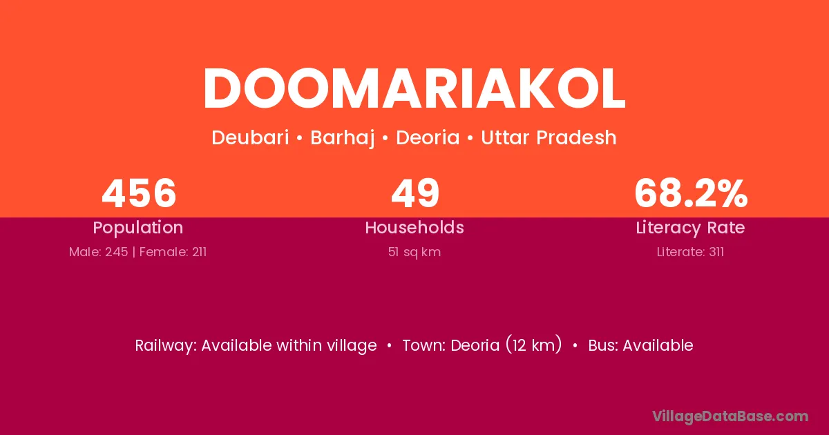 Deoria (12 km) is the nearest town to Doomariakol village for major economic activities and is located approximately 12 km away.