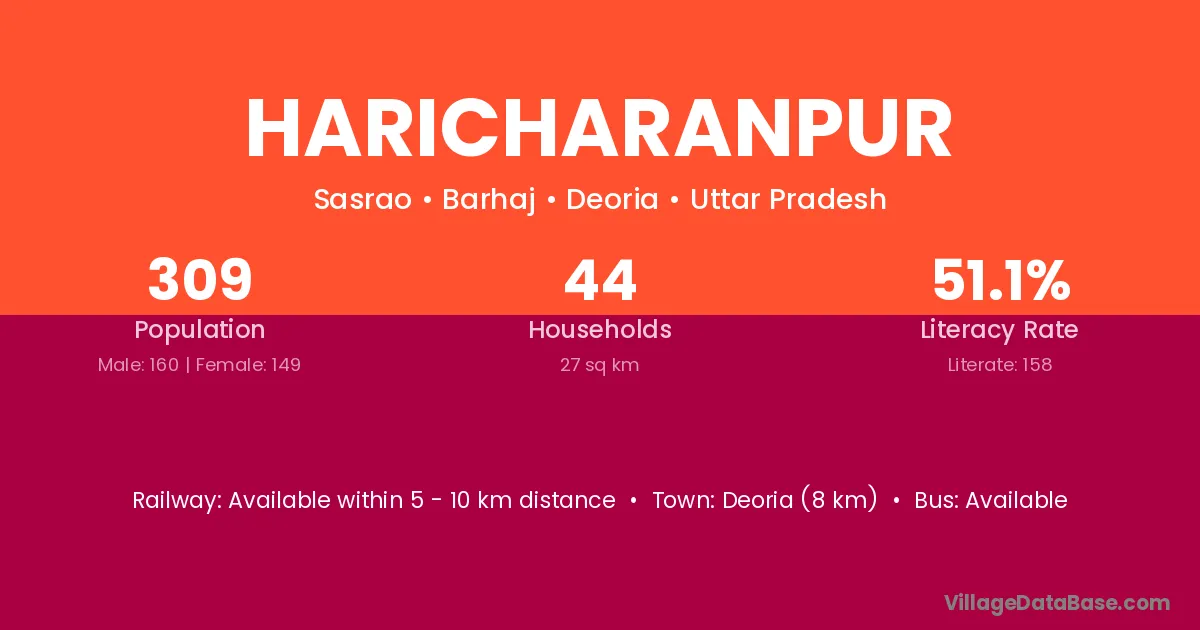 Deoria (8 km) is the nearest town to Haricharanpur village for major economic activities and is located approximately 8 km away.