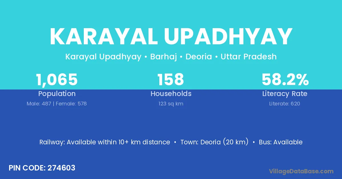 Deoria (20 km) is the nearest town to Karayal Upadhyay village for major economic activities and is located approximately 20 km away.