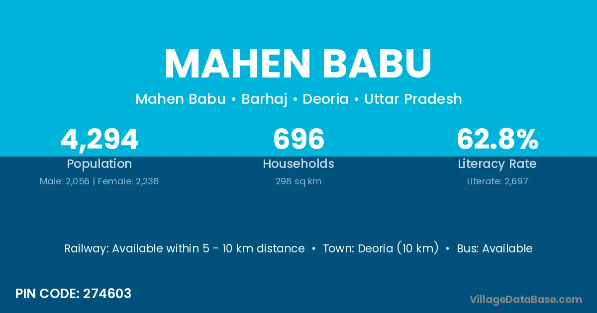 Deoria (10 km) is the nearest town to Mahen Babu village for major economic activities and is located approximately 10 km away.