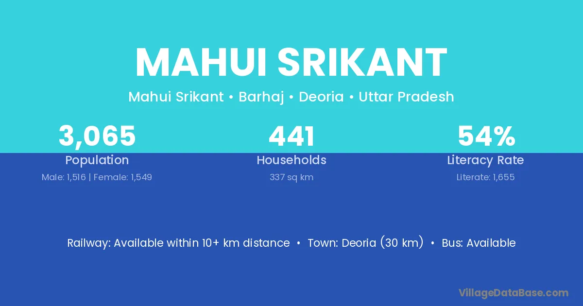Deoria (30 km) is the nearest town to Mahui Srikant village for major economic activities and is located approximately 30 km away.