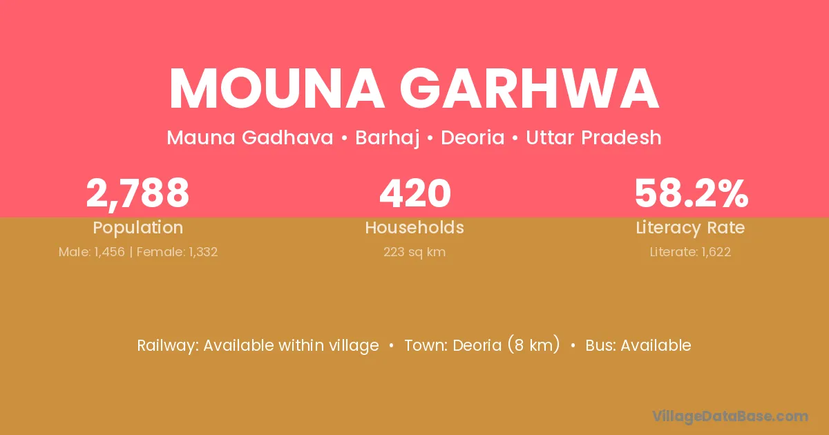 Deoria (8 km) is the nearest town to Mouna Garhwa village for major economic activities and is located approximately 8 km away.