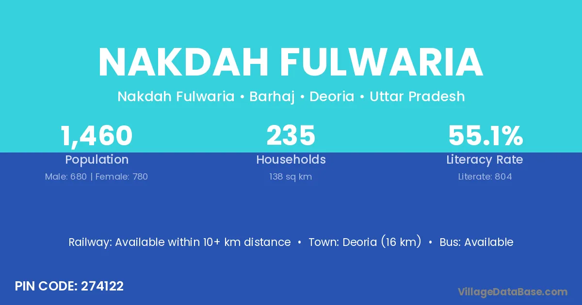 Deoria (16 km) is the nearest town to Nakdah Fulwaria village for major economic activities and is located approximately 16 km away.