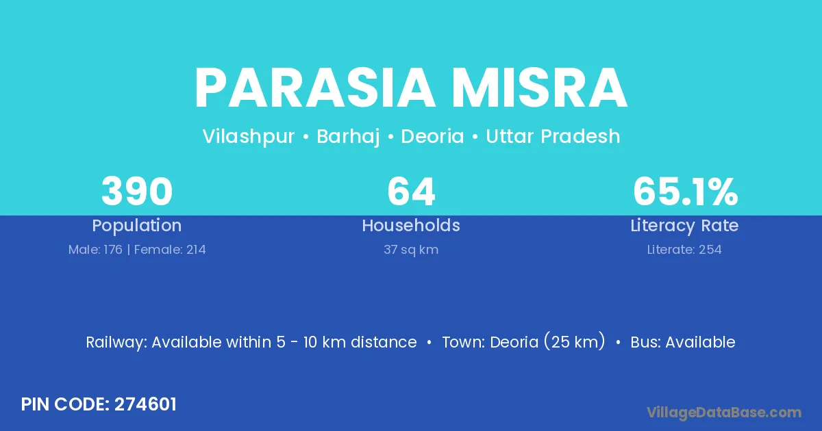 Deoria (25 km) is the nearest town to Parasia Misra village for major economic activities and is located approximately 25 km away.