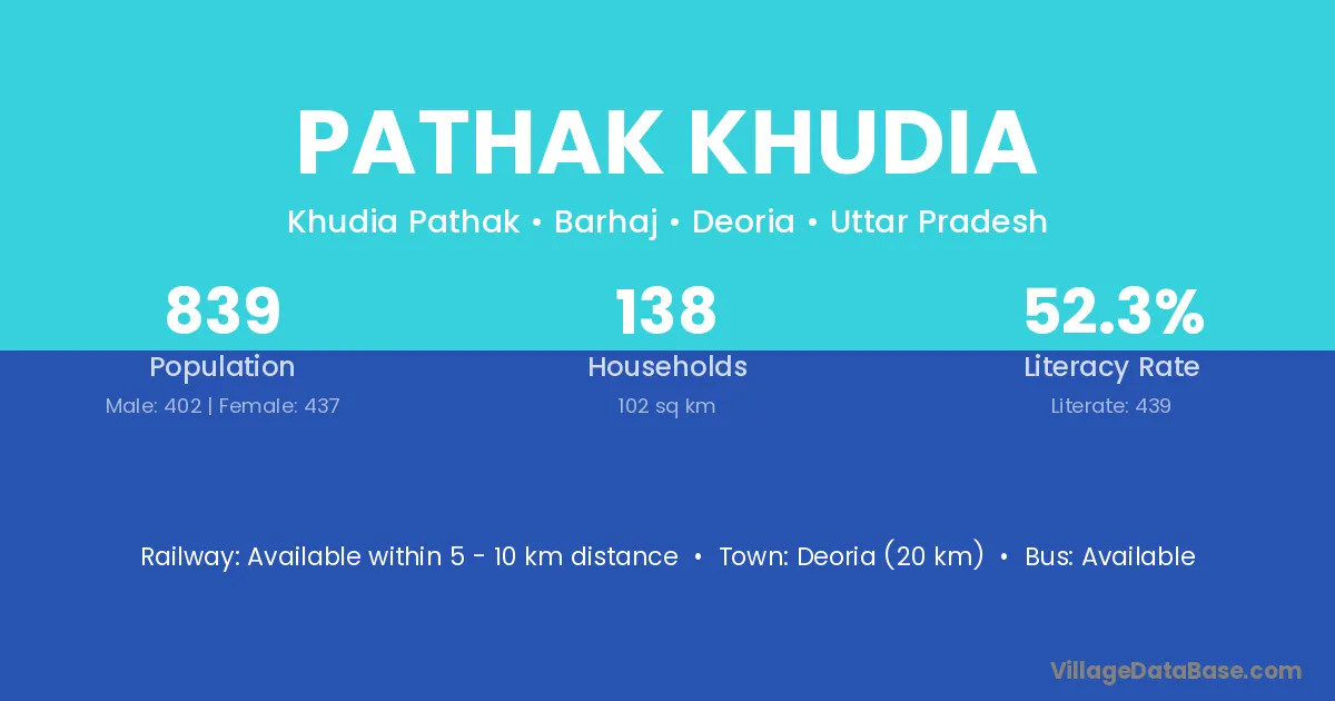 Deoria (20 km) is the nearest town to Pathak Khudia village for major economic activities and is located approximately 20 km away.