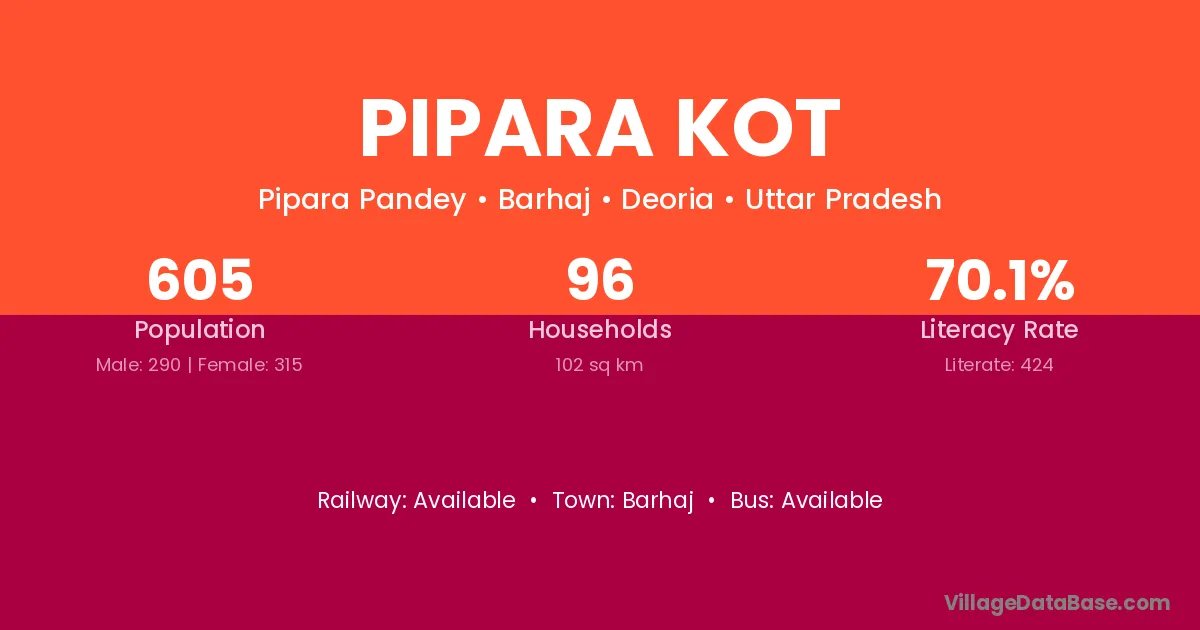 Pipara Kot village has a total population of 605 people, of which 290 are males and 315 are females.
