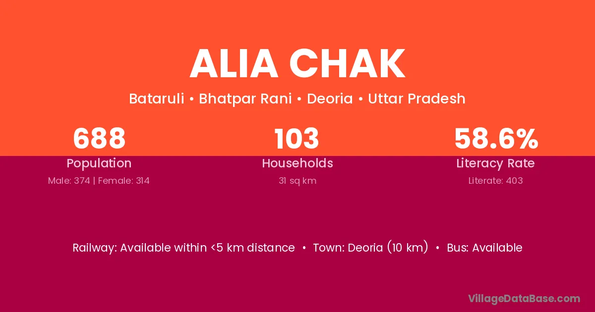Deoria (10 km) is the nearest town to Alia Chak village for major economic activities and is located approximately 10 km away.