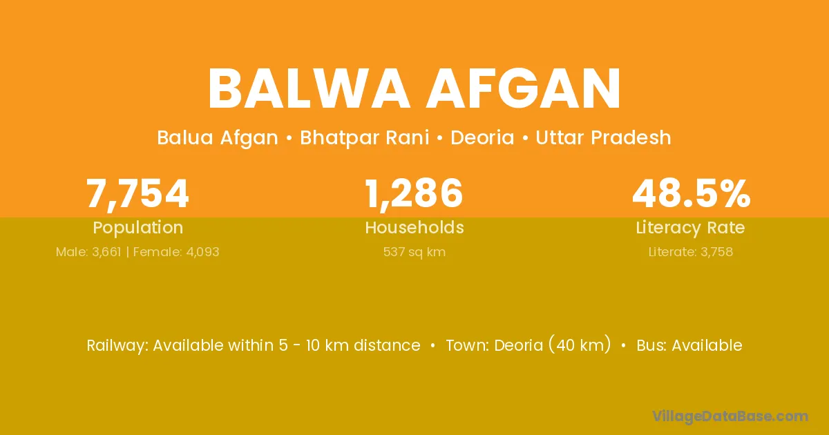 Deoria (40 km) is the nearest town to Balwa Afgan village for major economic activities and is located approximately 40 km away.