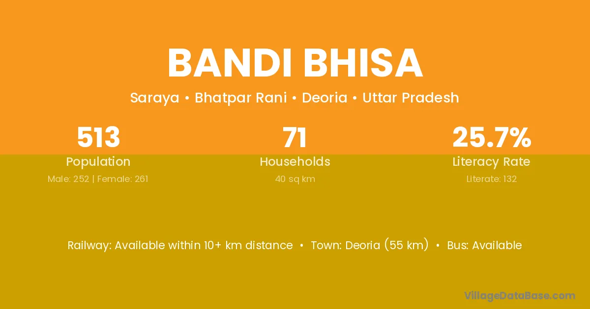 Bandi Bhisa village has a total population of 513 people, of which 252 are males and 261 are females.