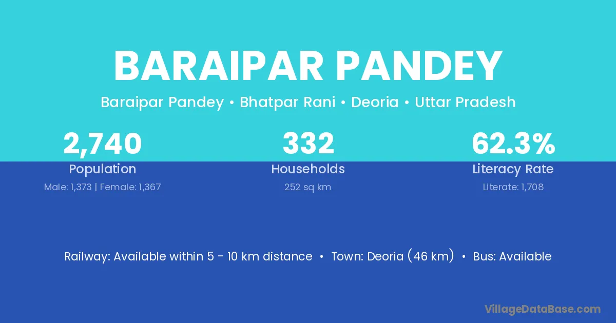 Deoria (46 km) is the nearest town to Baraipar Pandey village for major economic activities and is located approximately 46 km away.
