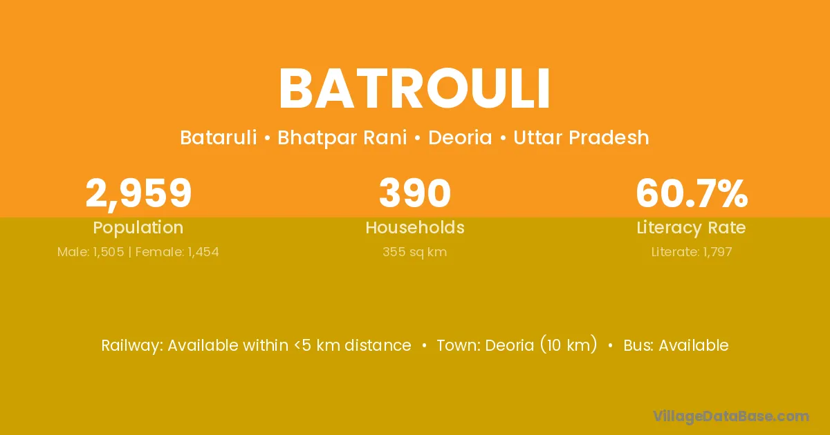 Deoria (10 km) is the nearest town to Batrouli village for major economic activities and is located approximately 10 km away.
