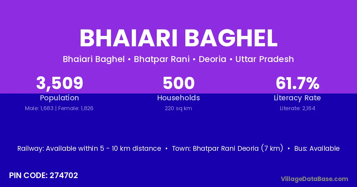 Bhatpar Rani Deoria (7 km) is the nearest town to Bhaiari Baghel village for major economic activities and is located approximately 7 km away.