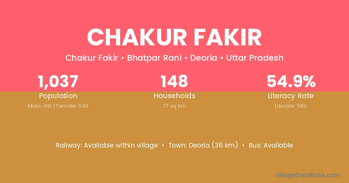 Deoria (36 km) is the nearest town to Chakur Fakir village for major economic activities and is located approximately 36 km away.