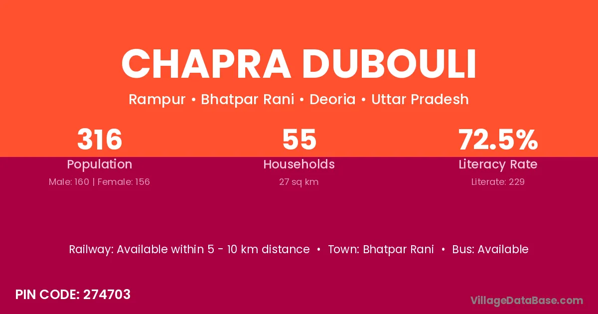 Chapra Dubouli village has a total population of 316 people, of which 160 are males and 156 are females.