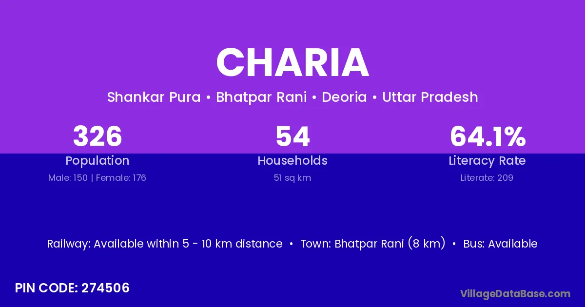 Bhatpar Rani (8 km) is the nearest town to Charia village for major economic activities and is located approximately 8 km away.