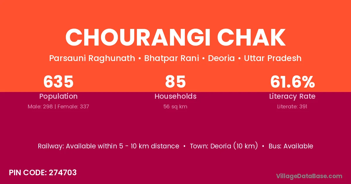 Deoria (10 km) is the nearest town to Chourangi Chak village for major economic activities and is located approximately 10 km away.