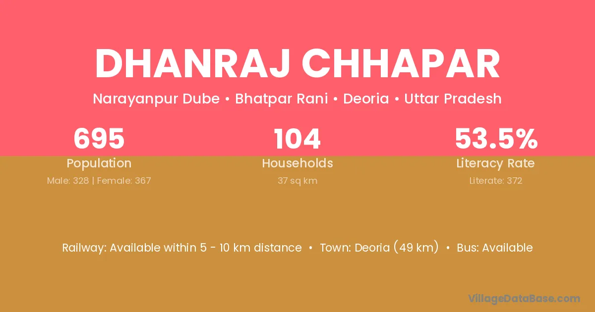 Deoria (49 km) is the nearest town to Dhanraj Chhapar village for major economic activities and is located approximately 49 km away.