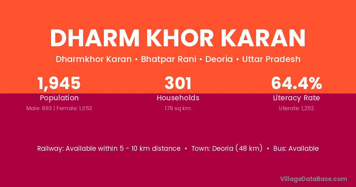 Deoria (48 km) is the nearest town to Dharm Khor Karan village for major economic activities and is located approximately 48 km away.