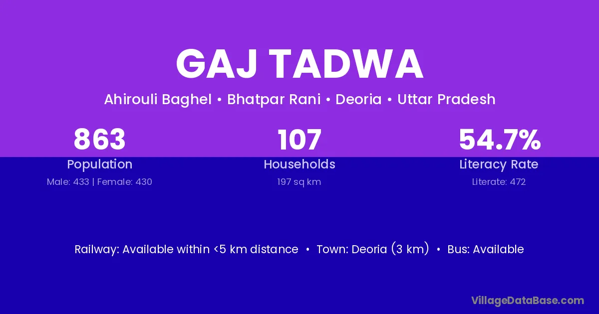 Deoria (3 km) is the nearest town to Gaj Tadwa village for major economic activities and is located approximately 3 km away.