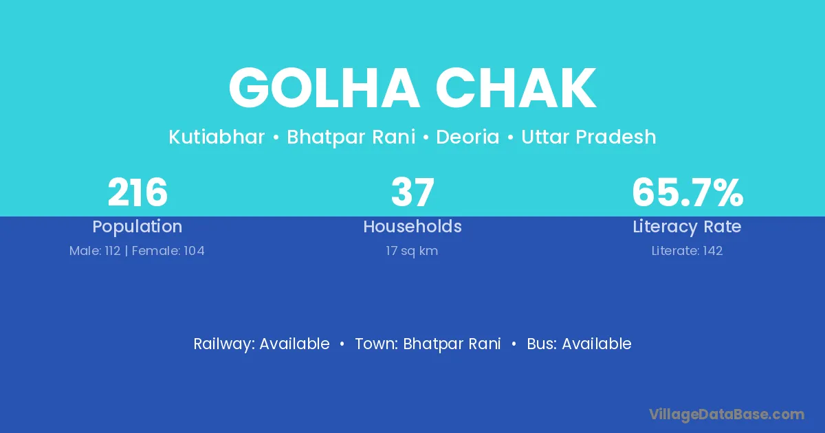 Golha Chak village has a total population of 216 people, of which 112 are males and 104 are females.