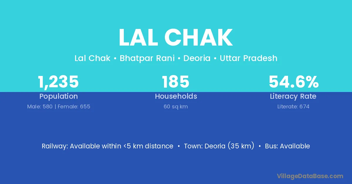 Deoria (35 km) is the nearest town to Lal Chak village for major economic activities and is located approximately 35 km away.