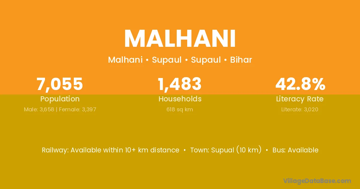 The literacy rate of Malhani village is 63.06%. Male literacy stands at 77.58% and female literacy at 50.00%.