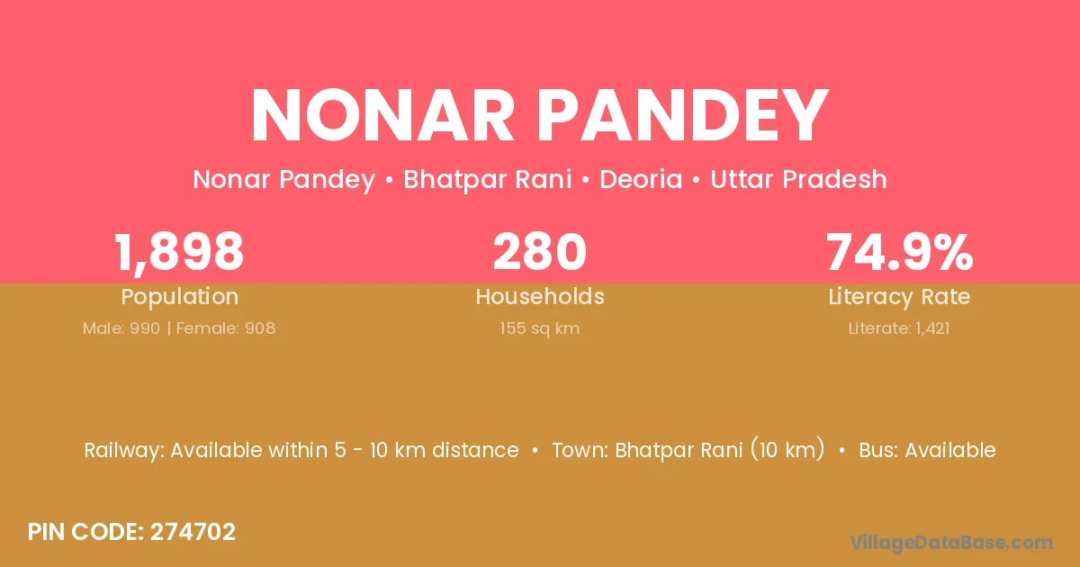 Bhatpar Rani (10 km) is the nearest town to Nonar Pandey village for major economic activities and is located approximately 10 km away.