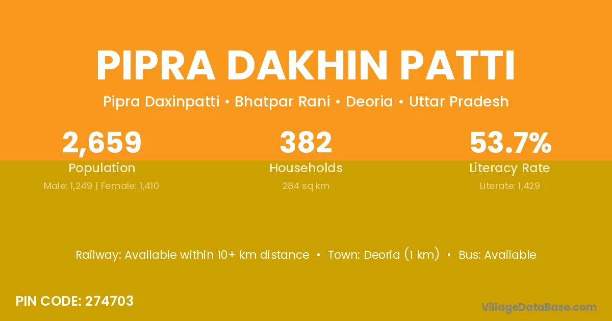 Deoria (1 km) is the nearest town to Pipra Dakhin Patti village for major economic activities and is located approximately 1 km away.