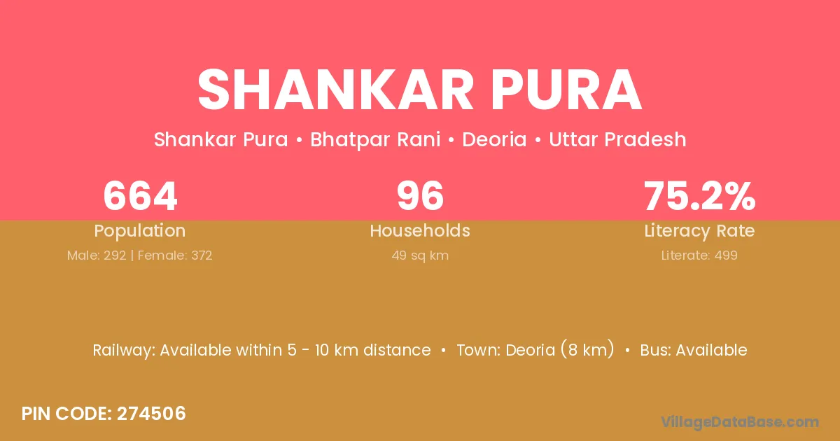 Deoria (8 km) is the nearest town to Shankar Pura village for major economic activities and is located approximately 8 km away.
